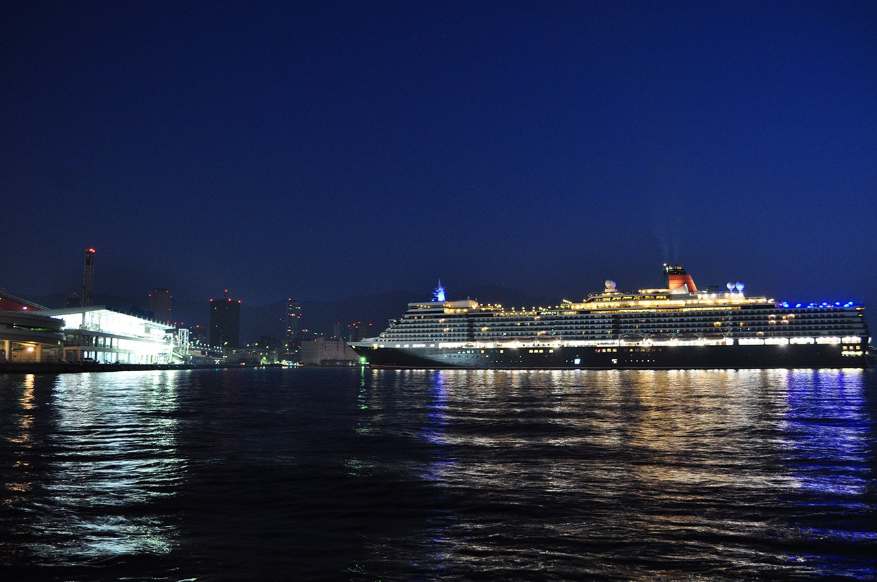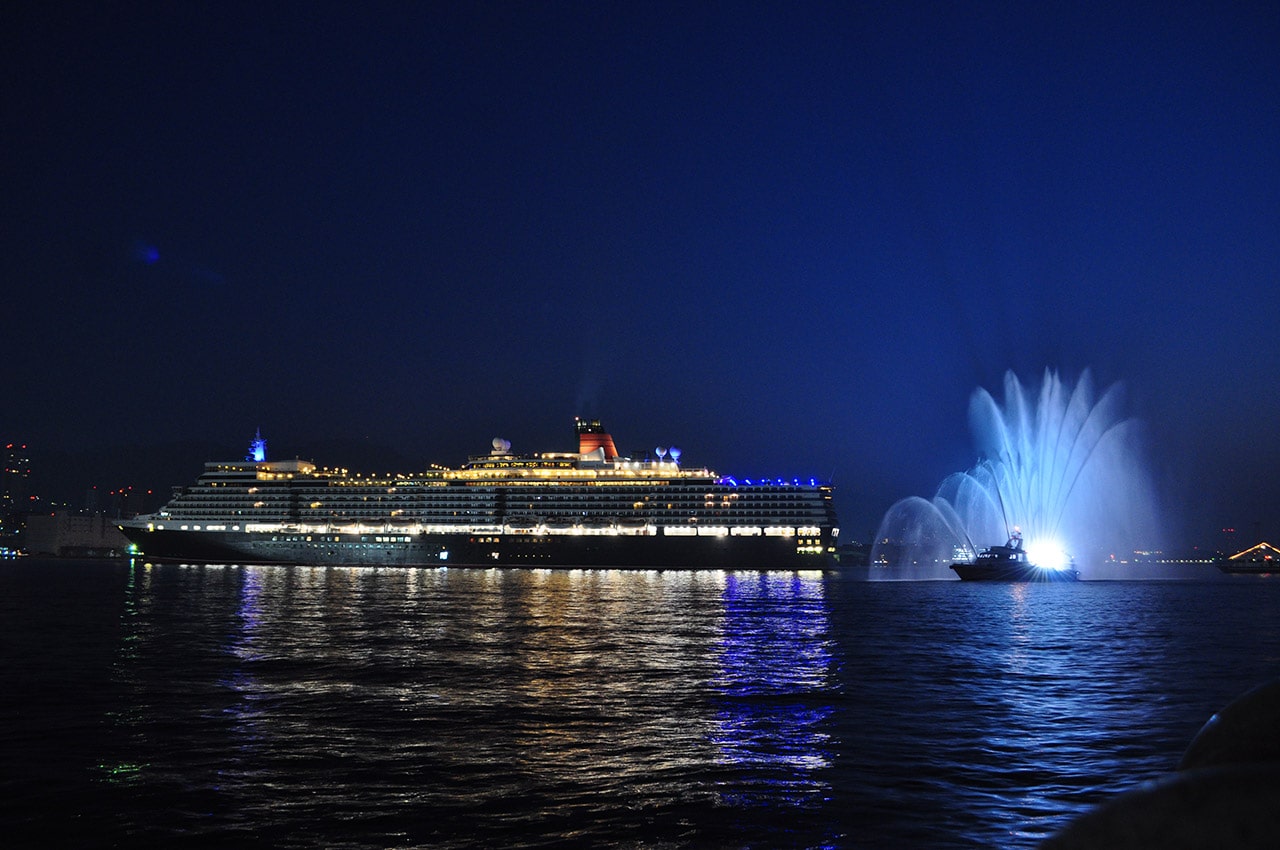 早暁の闇に浮かび上がるクイーンエリザベス号の存在感は圧倒的だった。ライトアップされた放水も幻想的に浮かび上がる。船のゆったりとした優雅な動きにあわせて、船に押し出された波もゆったりと優雅に岸に迫ってくる。全てが幻想的だった。