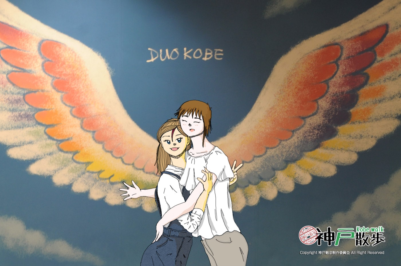 神戸駅からDUO神戸に降りたところにある天使の羽。意外と人が少ないインスタ映えスポットでした。ポージングはかなり悩みました。最初は響子さん一人のイラストだけで考えていましたが、こういう場所は友達とキャッキャするのが普通かなと彩ちゃんとのイラストを追加しました。