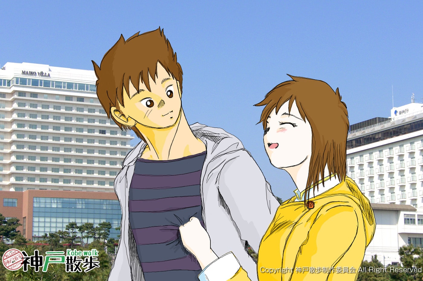 二人の背後に見えるのは須磨・垂水区民にはおなじみの「舞子ビラ」です。