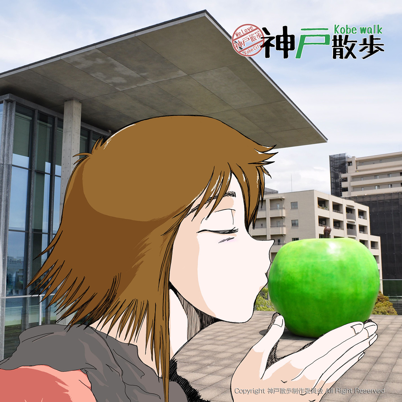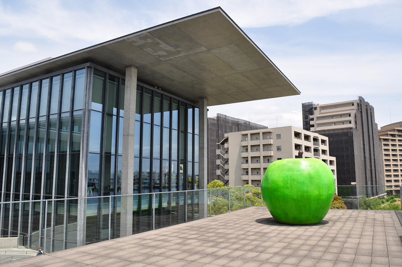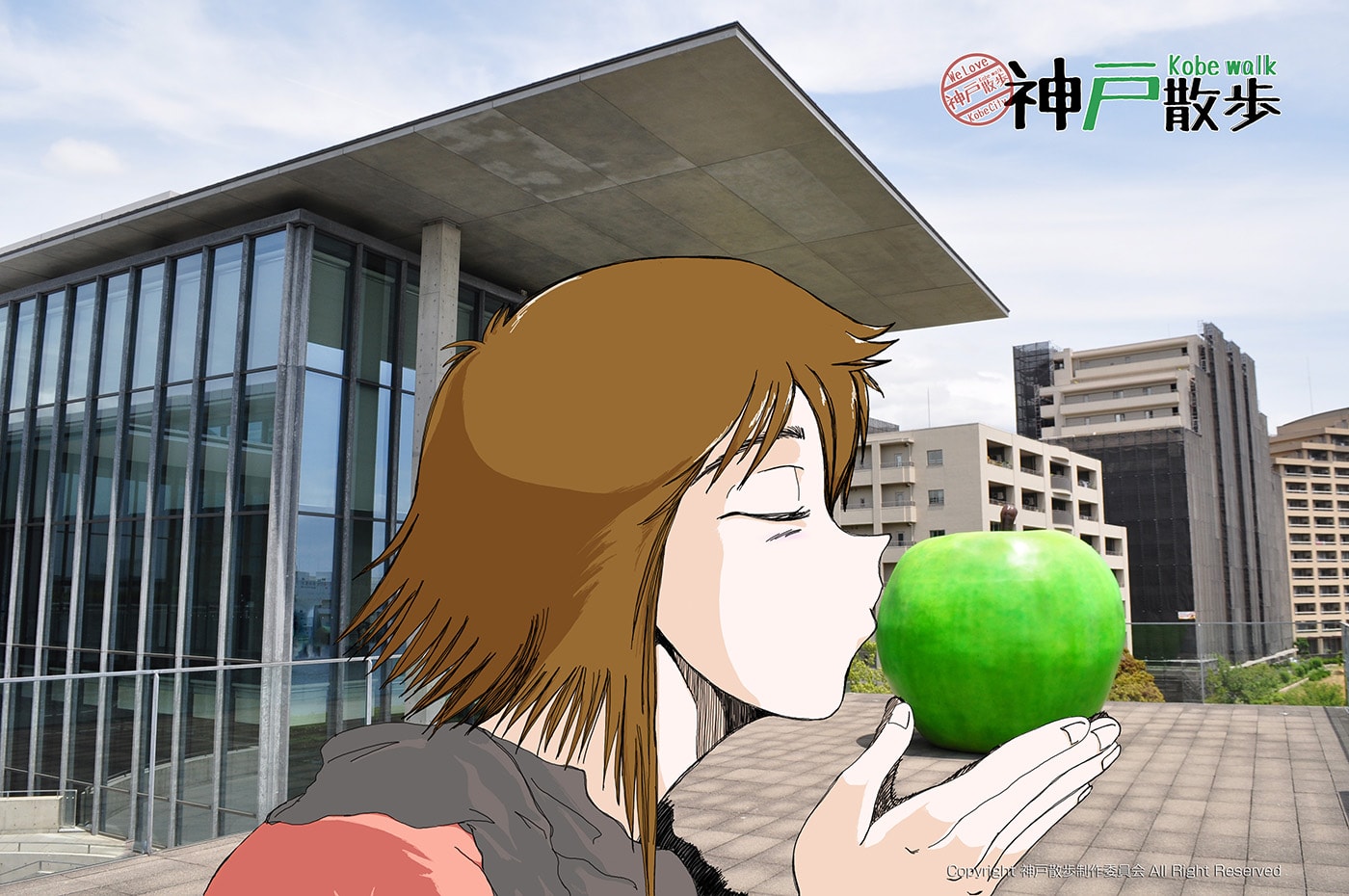 兵庫県立美術館にある安藤忠雄氏デザインの青りんごをトリックフォト風に