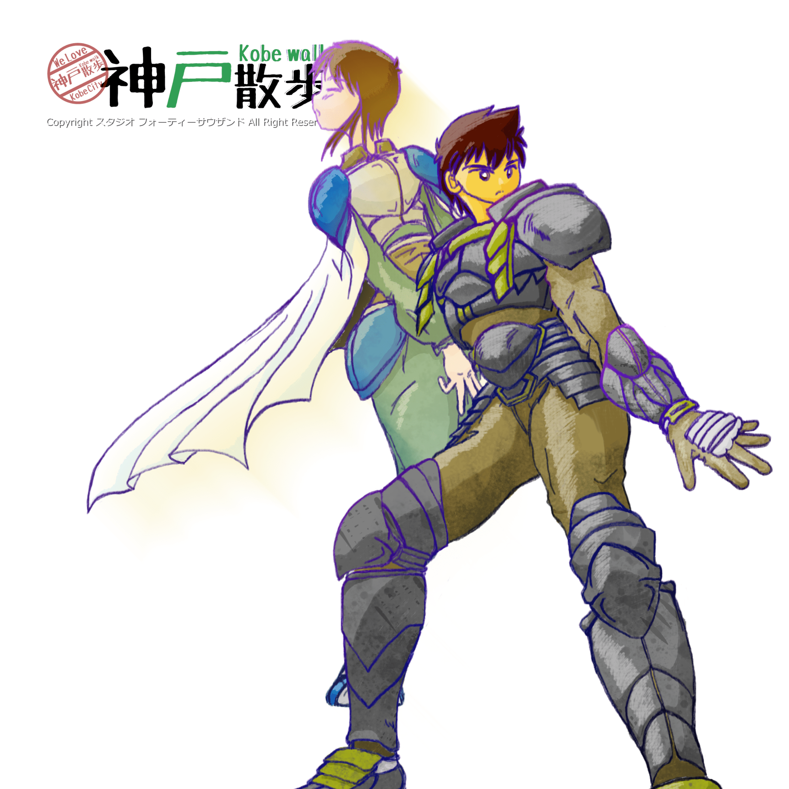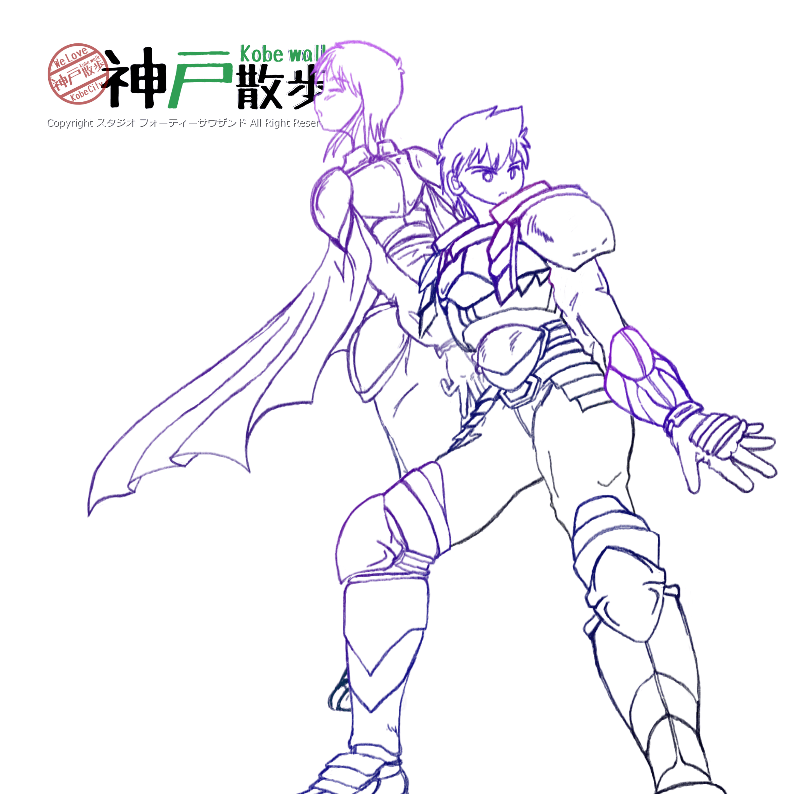 二人の鎧のデザインが今どきではない感じが強いですが、私は80年代~90年代後半くらいのファンタジーを通ってきた者なのでご勘弁を。厨二病なんて言葉もない時代でしたが、無心にこんなイラストを描きたおしてた頃を思い出して楽しく描けました。