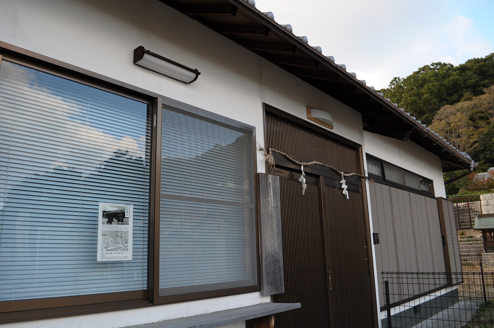 拝殿に左側には猿田彦命(さるたひこのみこと)をお祀りした社がありました。鉄扉に閉ざされた石垣の上がどうなっているのか気になってしまいます。