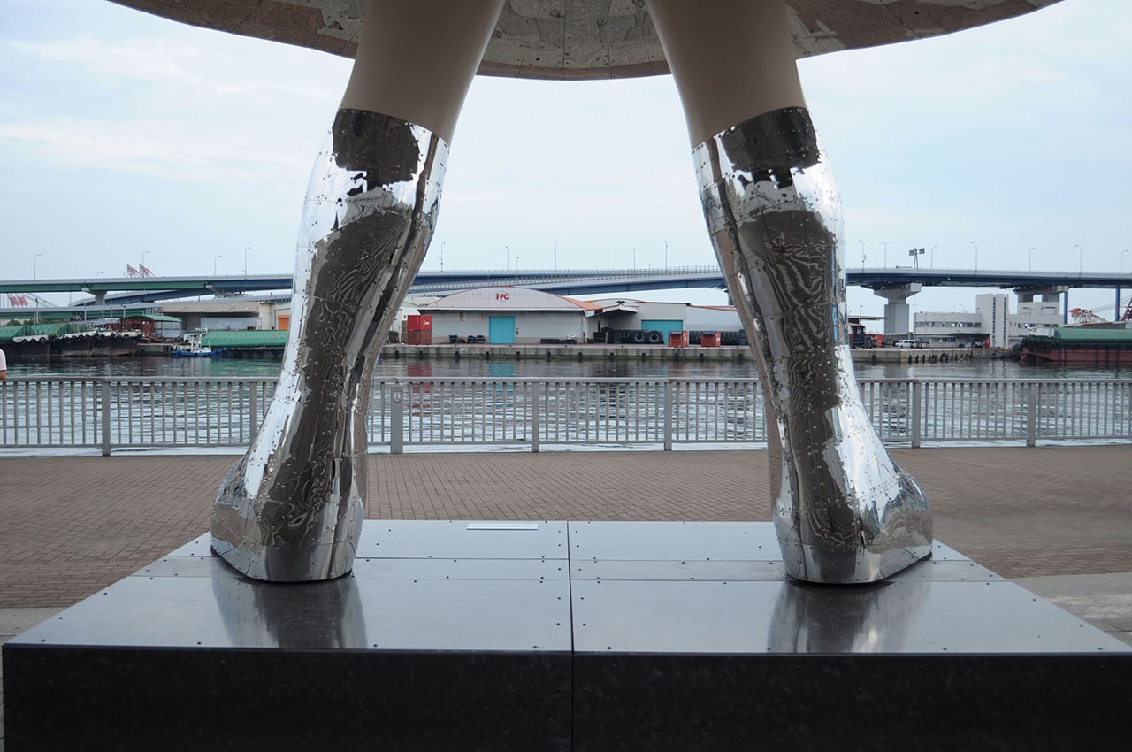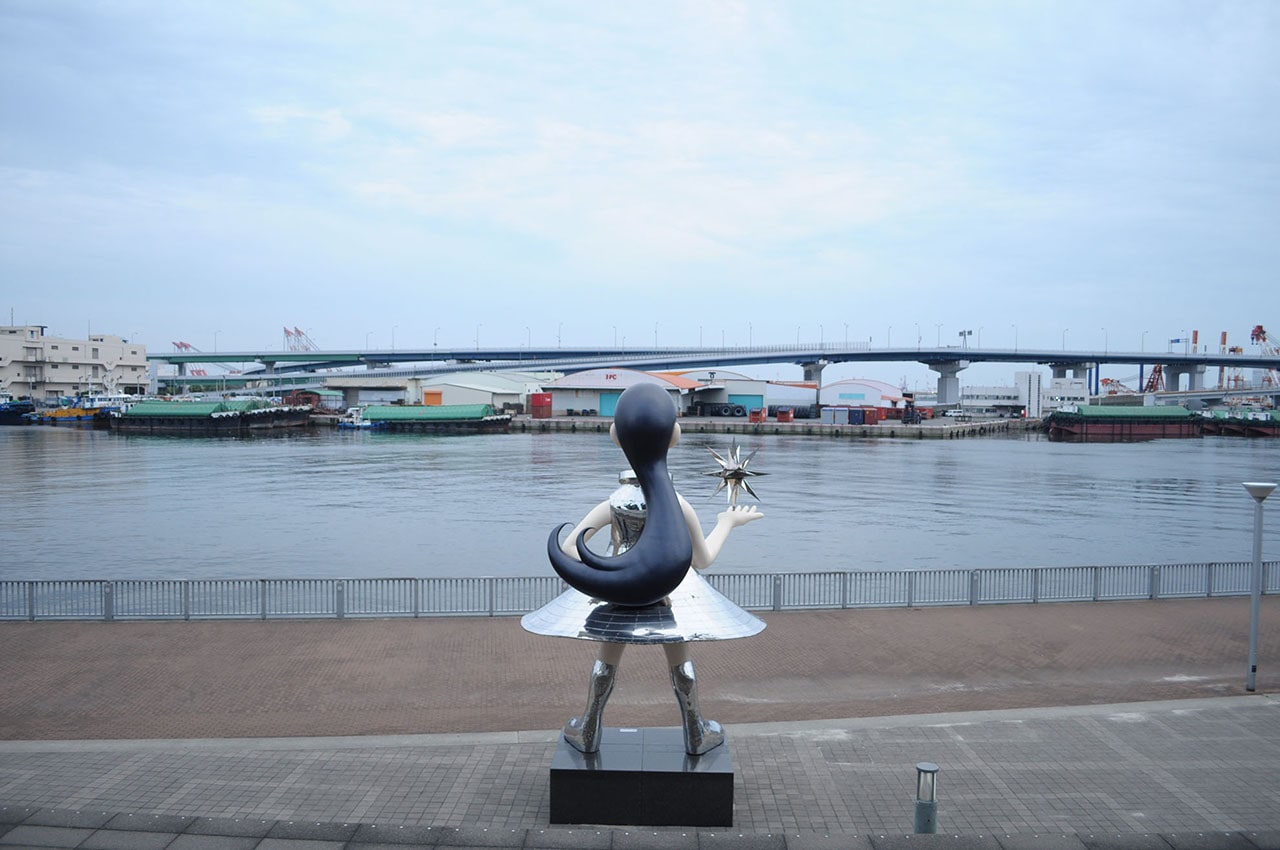 サン・シスター「なぎさ」。阪神・淡路大震災20年のモニュメントとして建立された彼女は、過去・現在・未来を見つめ、希望の象徴としての「輝く太陽」を手に持ち大地に立ち、世界中のすべての災害からの復興・再生を見守っています。