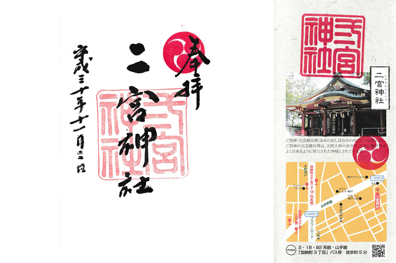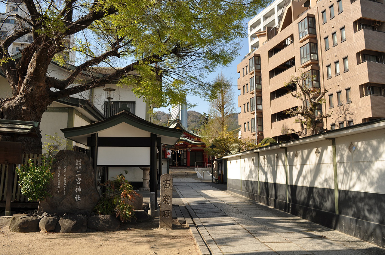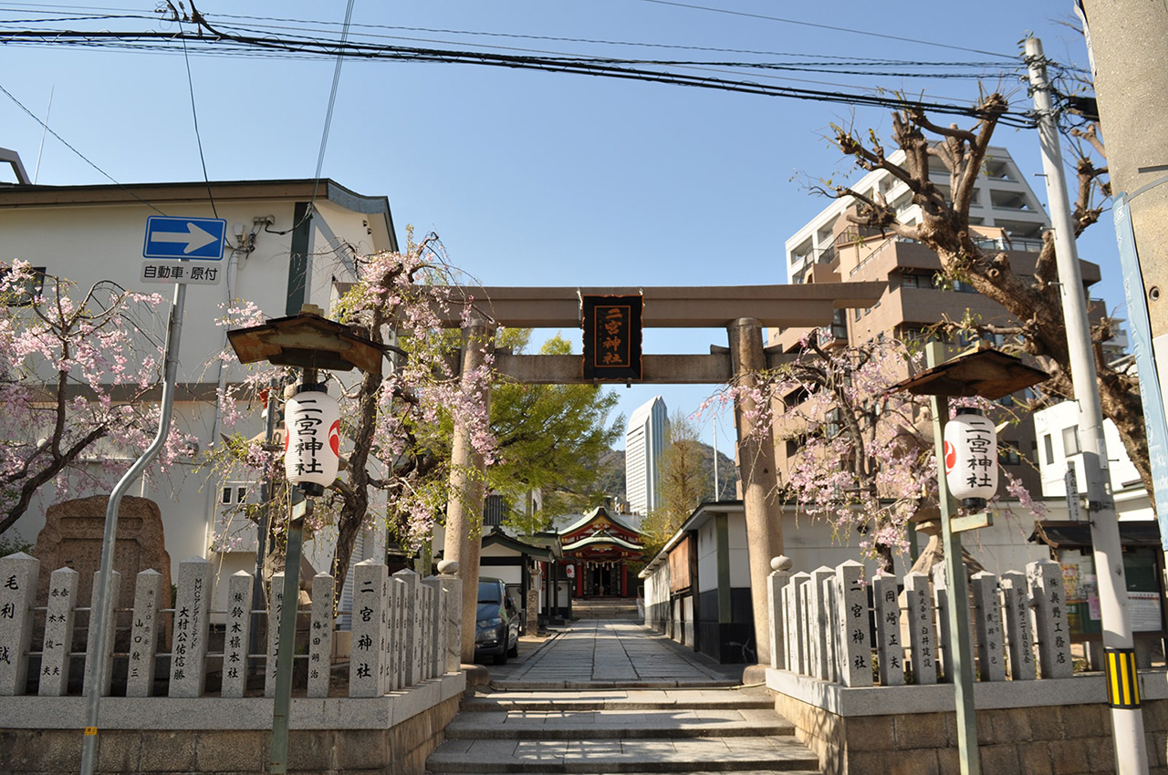 八社神社の中では一番東に位置する二宮神社。一宮神社からフラワーロードを渡り少し東へ移動します。レトロな雰囲気漂う二宮商店街を横切り、いい感じの二宮市場を横目に見ながら進んでいくと、町の外れに現れる神社が二宮神社です。5分も歩けば賑やかな三宮がすぐ側にあるとはとても思えない静かな雰囲気でやや昭和のにおいを残す場所です。