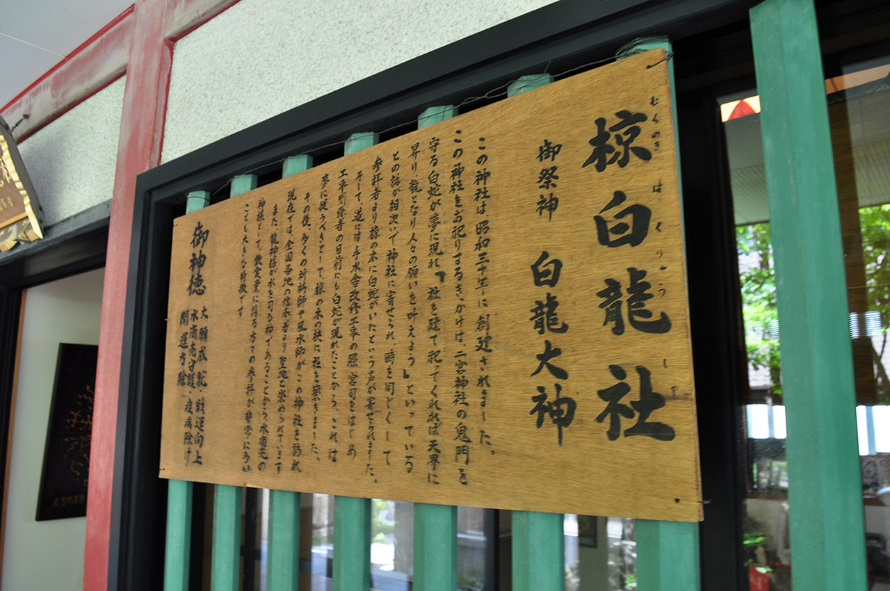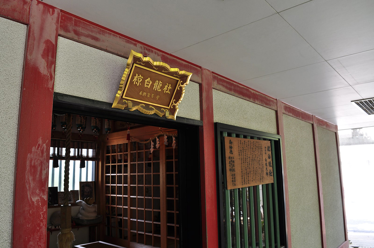 稲荷神社の隣に椋木白龍神社の境内があります。こちらは立派な入り口で室内でお参りします。中には白蛇が祀られていました。昭和三十年創建ということで新しい神社の部類に入るのではないでしょうか。 夢に現れる白蛇からご神託を受け、実際に白蛇が現れるという神話の王道ですが、昔話ではなく、身近な時代の話であったということにもロマンを感じます。