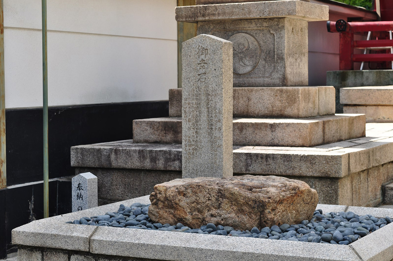 境内の前に設置されている御幸石。生田神社が砂山にあった昔、大水害で現在の場所に移築する間、御神体をお祀りしたとされ、そのときにご神体を奉安したとされる石です。周囲は結界が張られていては入れません。厳かに祀っています。