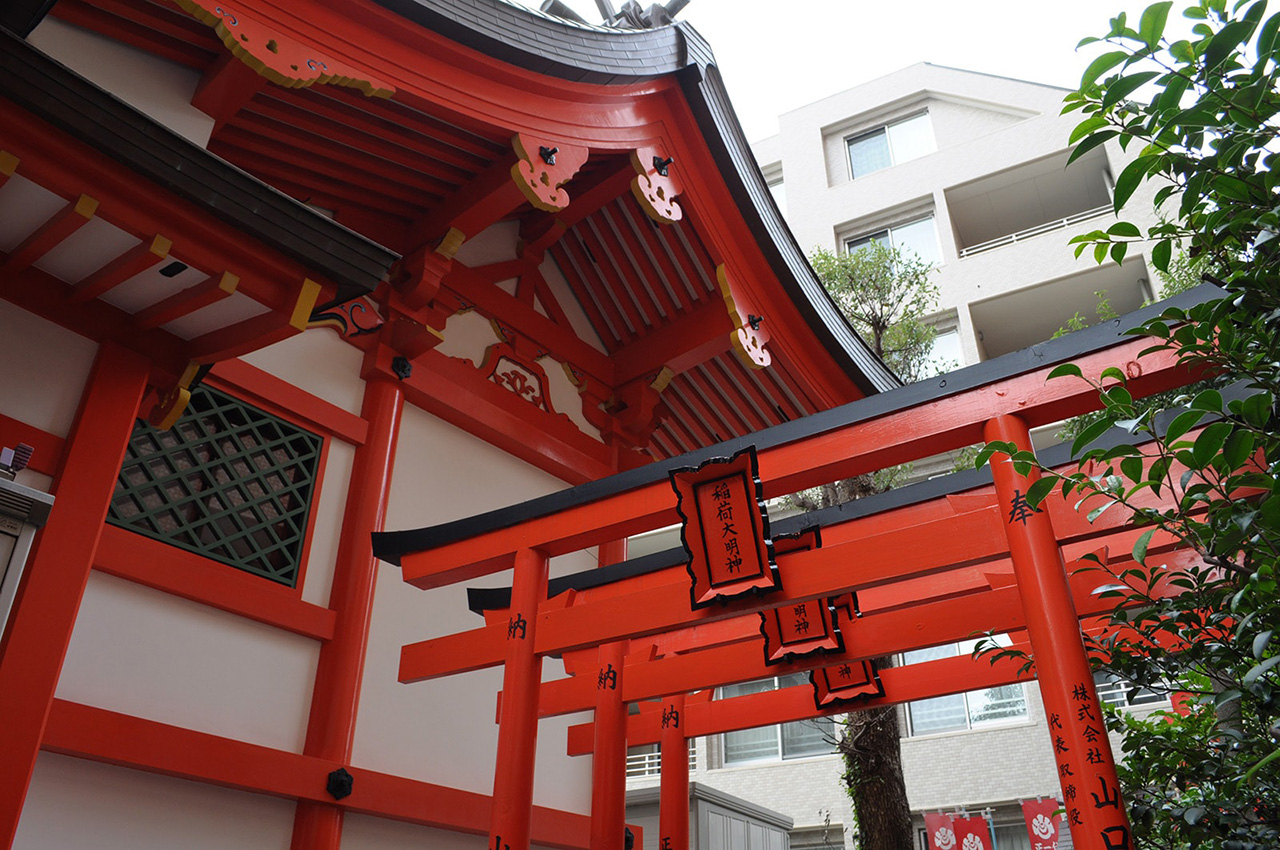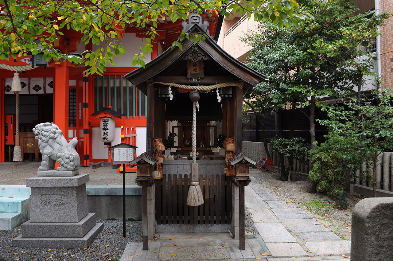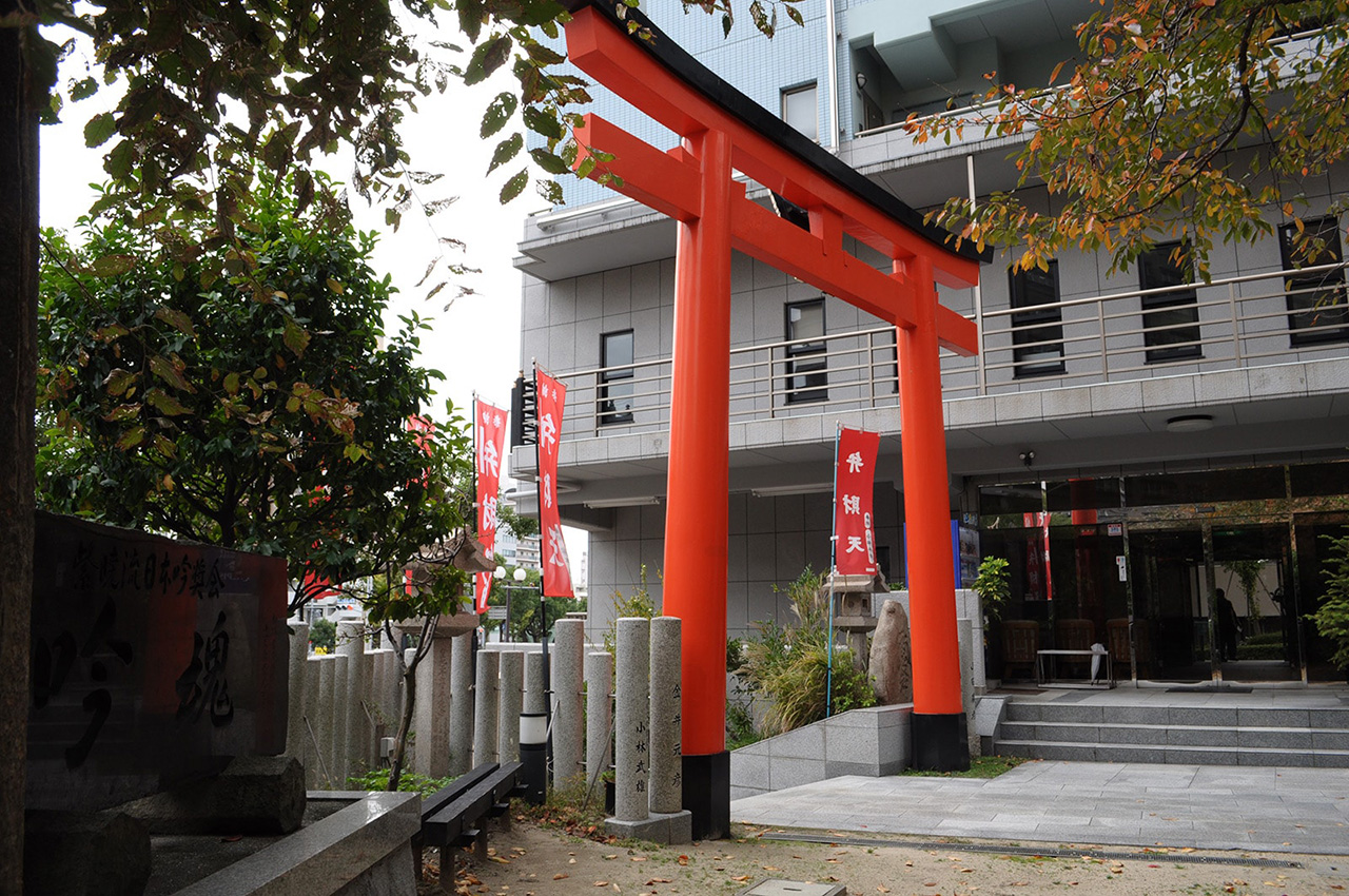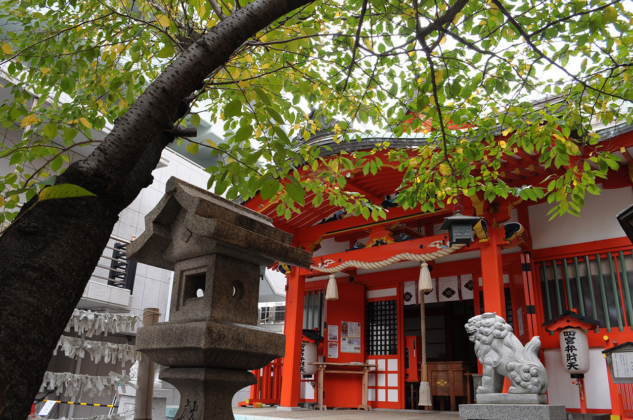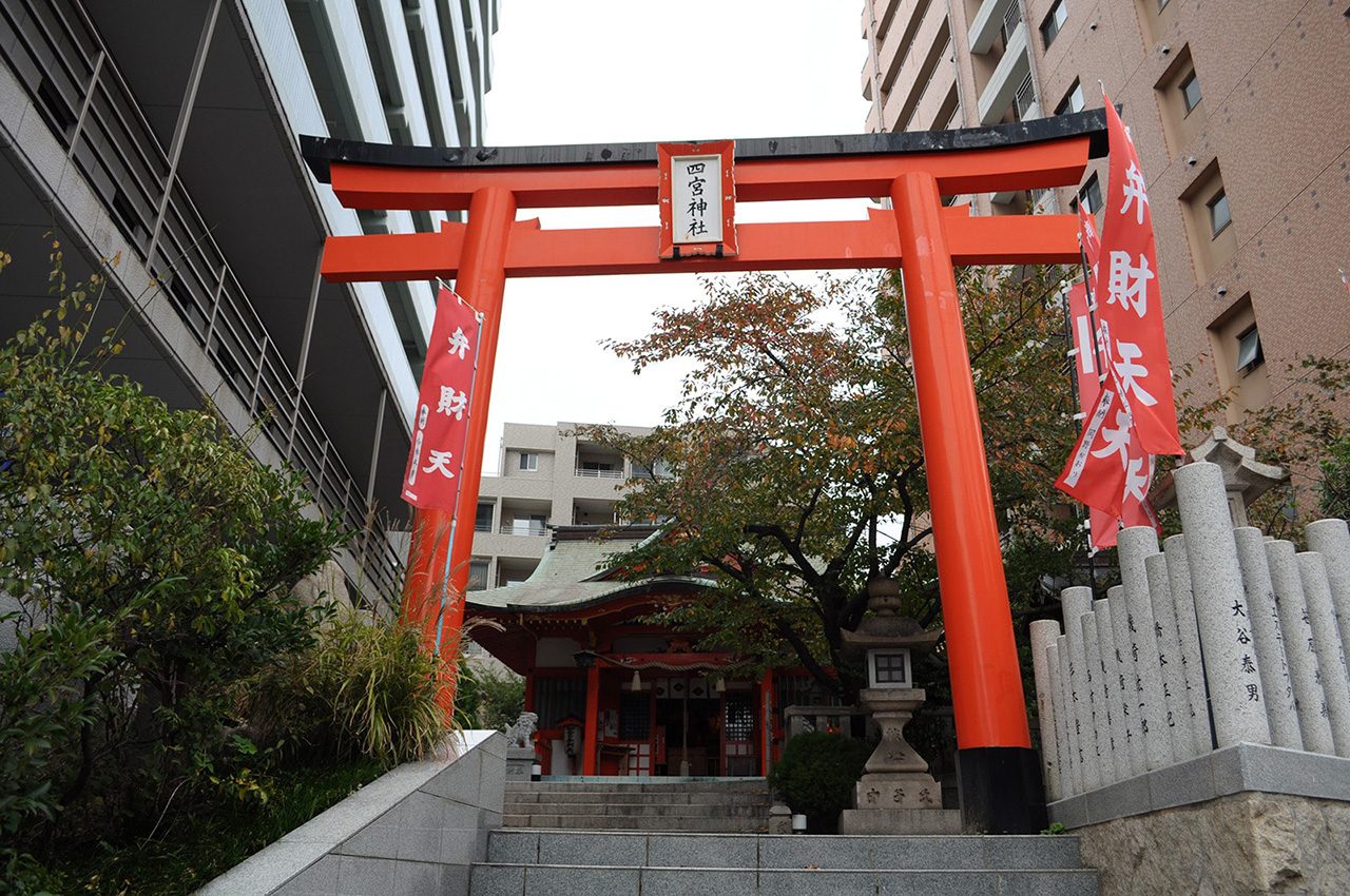 八社神社の4番目の神社となる四宮神社。県庁前から少し山側に上がるとビルの谷間に色鮮やかな鳥居が目に飛び込んできます。