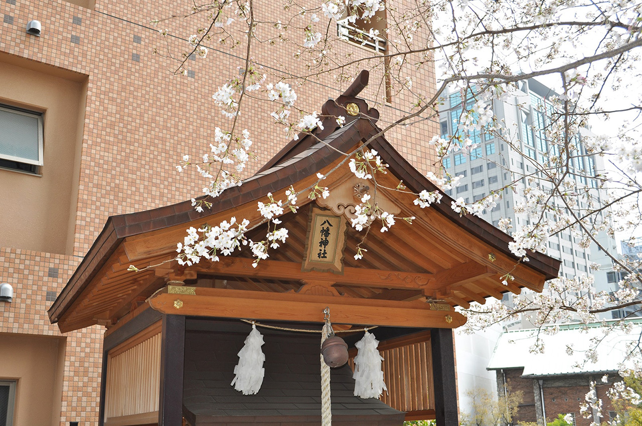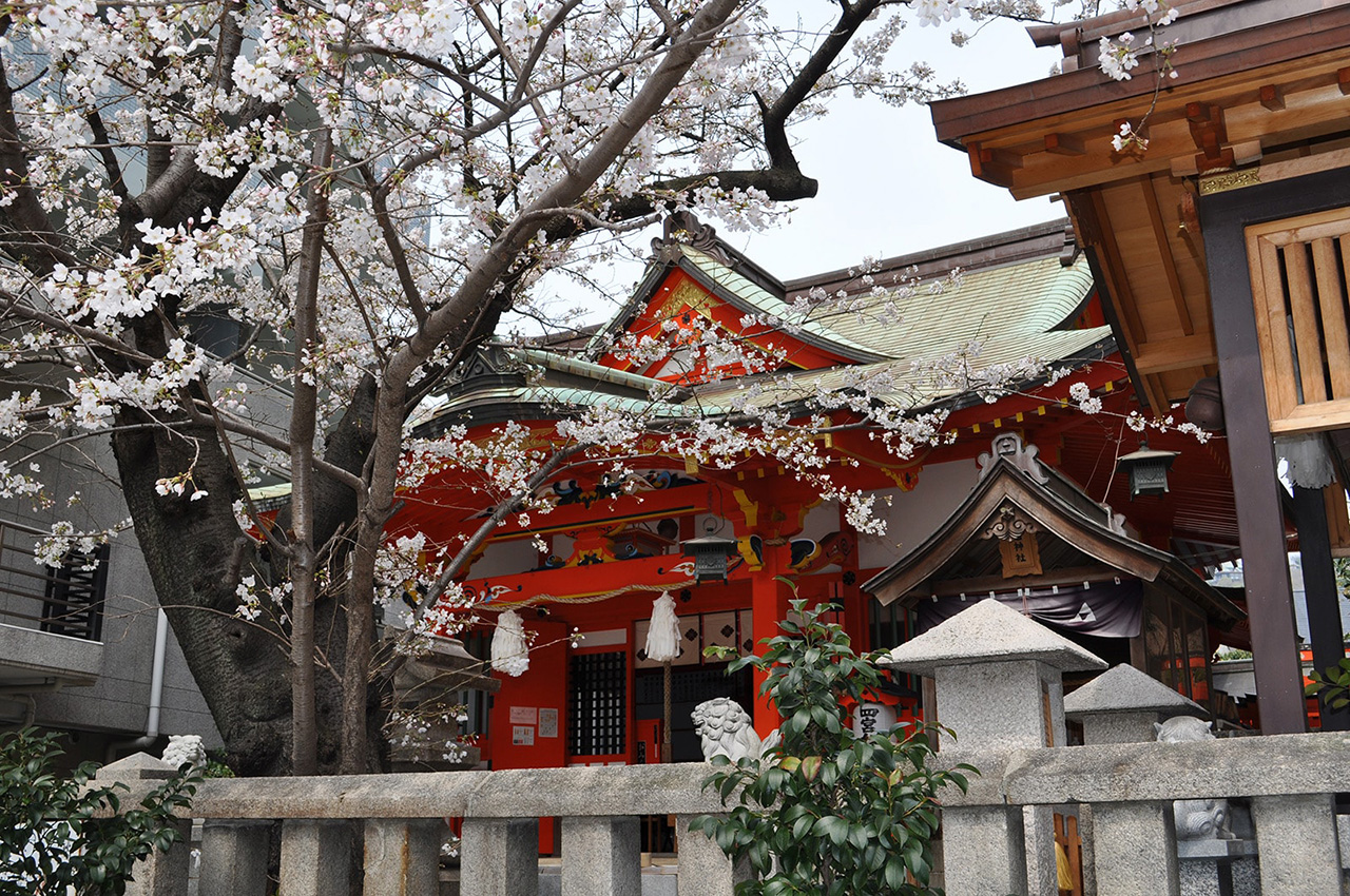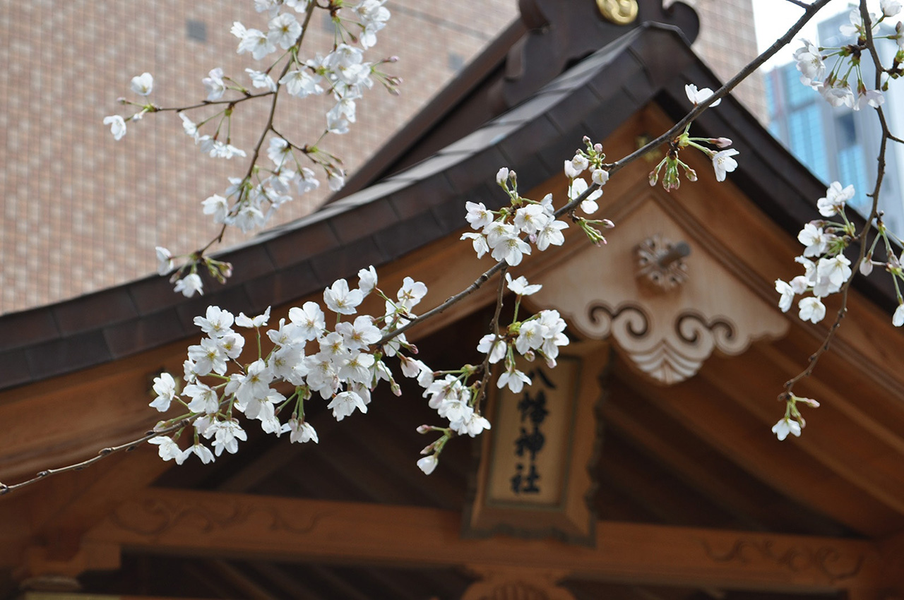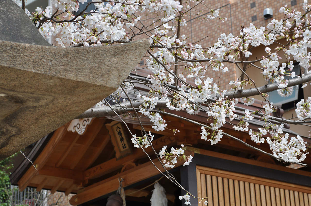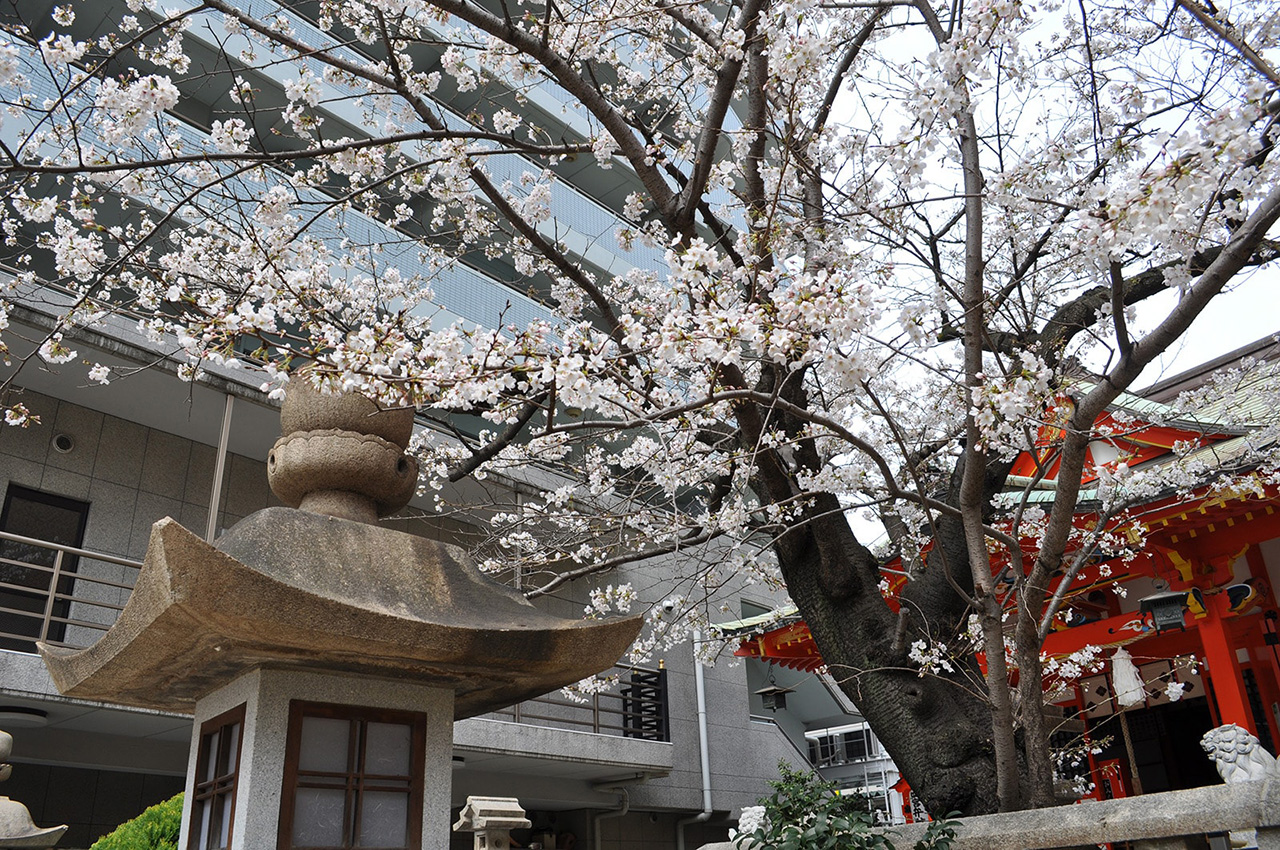 境内には桜の木が植えられています。たくさん植えられているわけではないのですが、朱色の拝殿と相まって美しい景観をみせてくれます。
