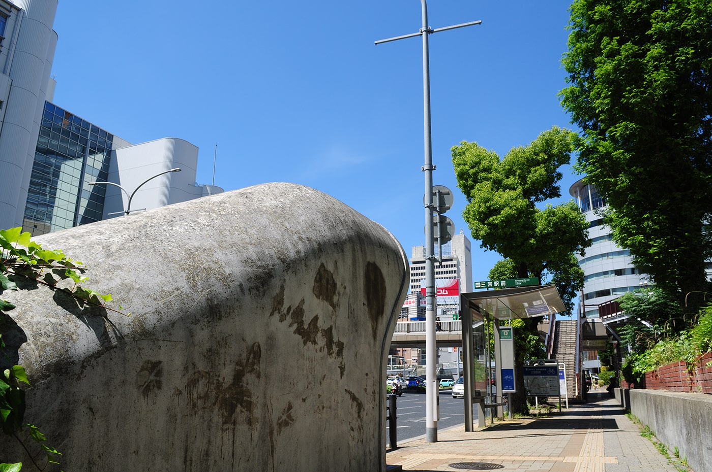反対側のミント神戸の方から来るとガリバートンネルの後ろ側から来ることになります。手前には自転車の駐輪場やバス停があります。