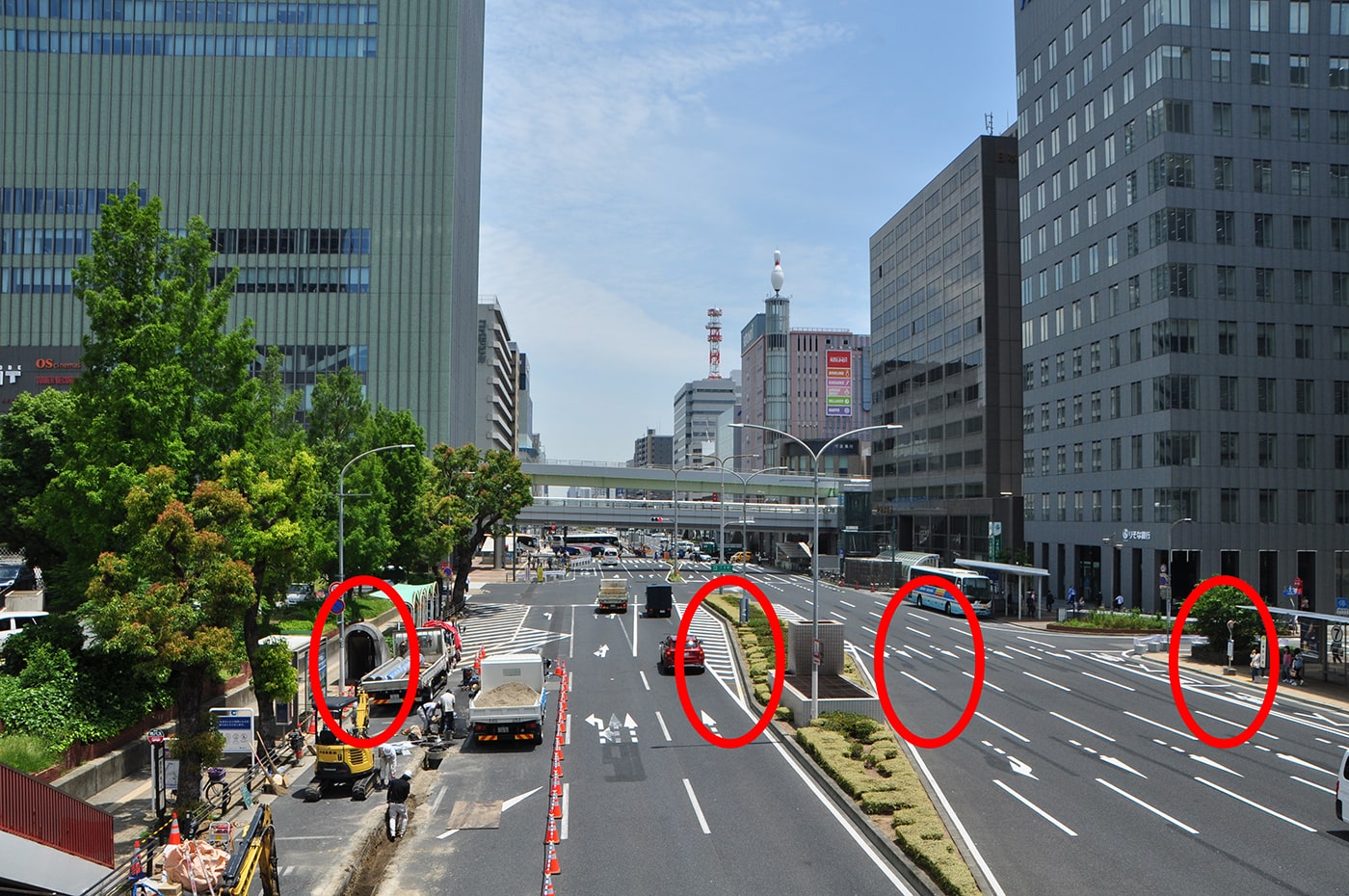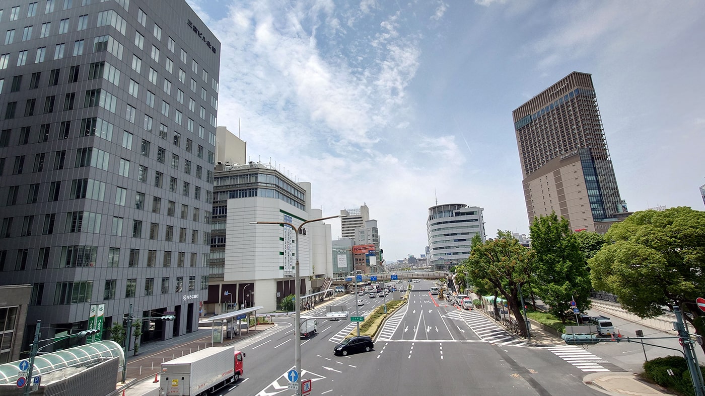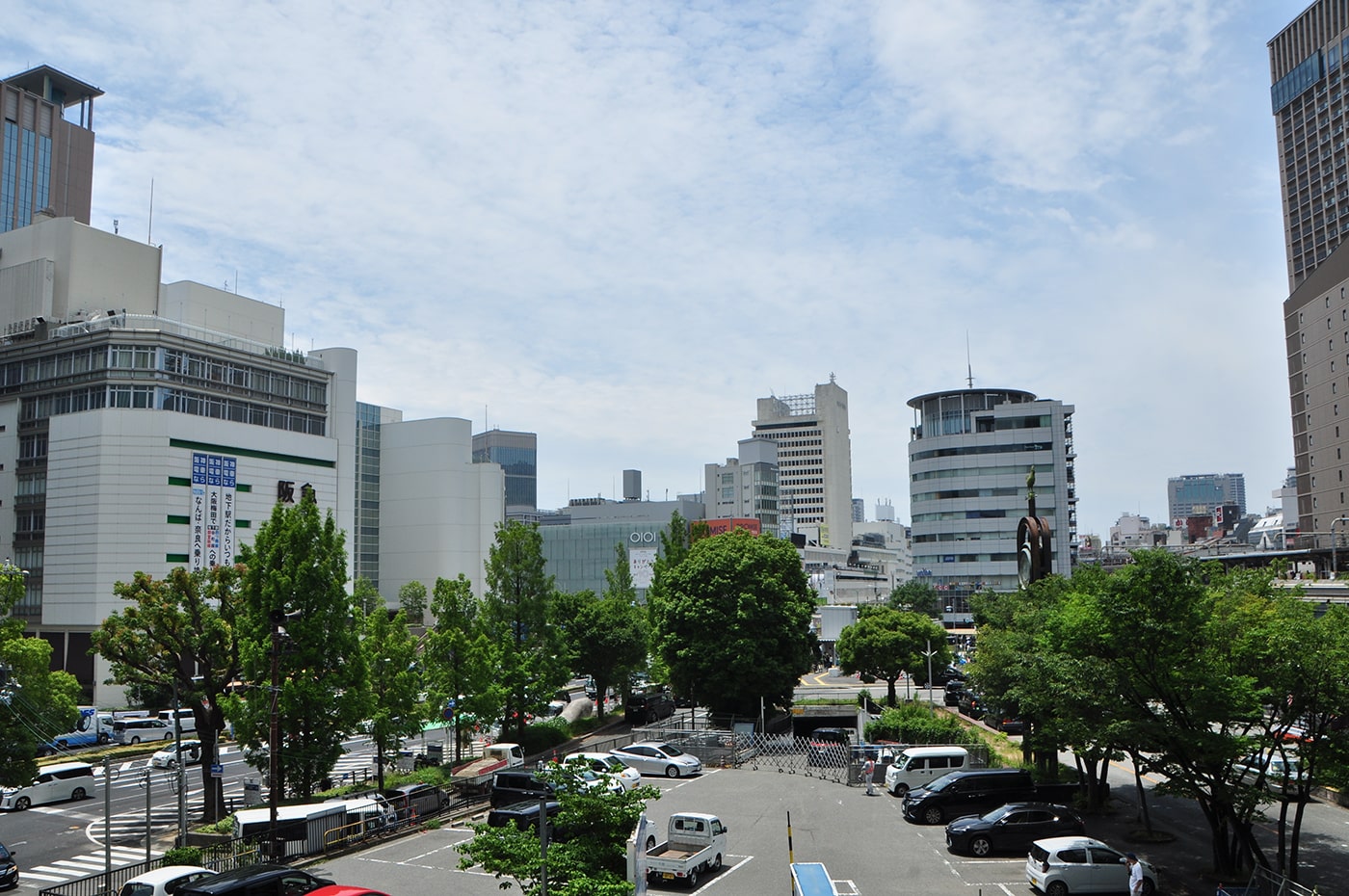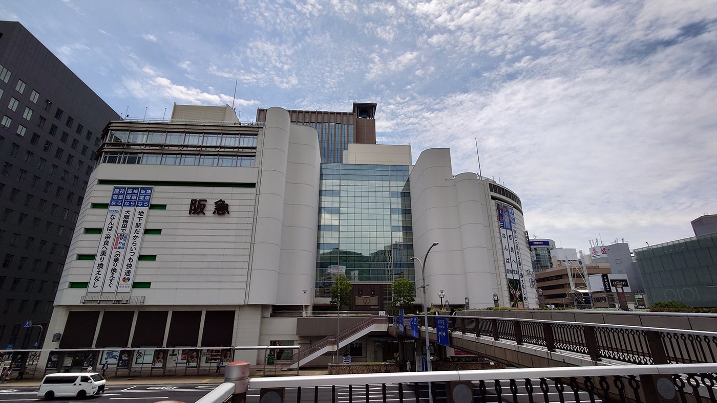 今回は駅南側のロータリーを通って阪急百貨店に渡る歩道橋に向かい、歩道橋を渡らずに、橋の手前の階段を降りて入口を目指しました。