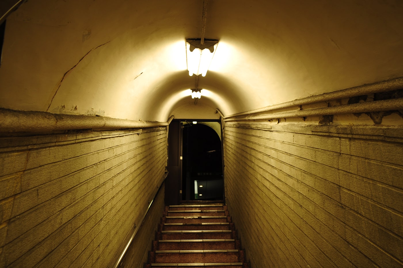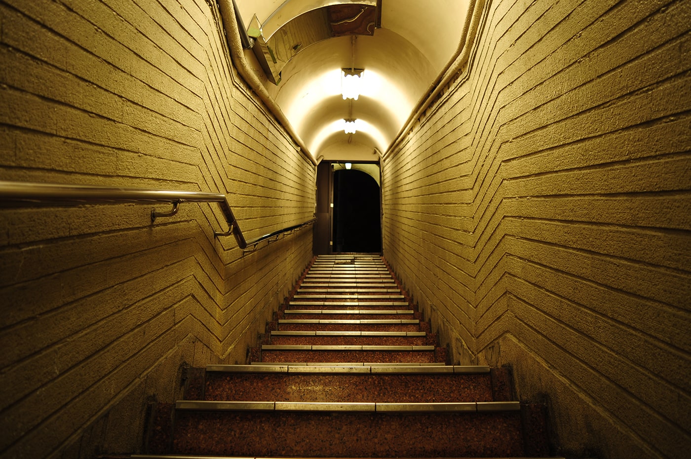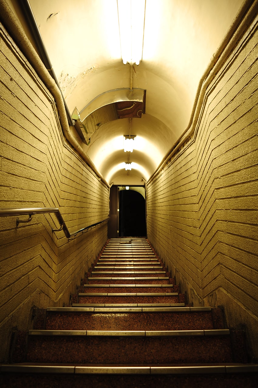 入口を覗くと地下への階段が待っています。短い階段なのですが、レトロで魅力的な通路です。見てるだけで妄想を掻き立てられてワクワクします。