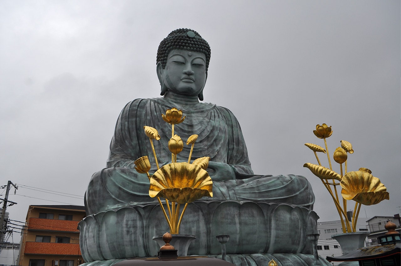 今の大仏様は二代目で1991年(平成3年)に再建されたもので比較的新しいんですね。それで知名度がいまいちなのかもしれません。能福寺というお寺で拝観できます。高さが11mもあって、台座まで合わせると18mもの高さになります。近くで見ると圧巻です。初代は明治時代に建立されて「日本三大仏」の一つと言われていましたけど、第2次世界大戦の時に金属類回収令で金属資源として回収されたそうです。